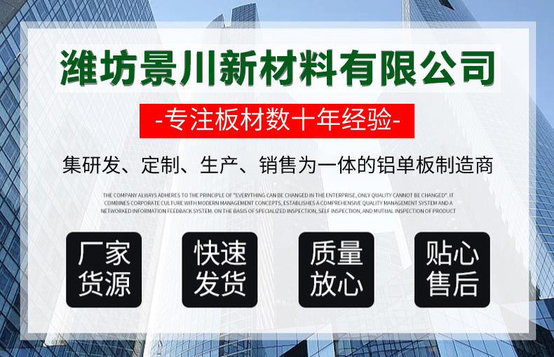 濰坊景川新材料有限公司是一家集各種鋁單板、異型鋁單板、鋁天花板、氟碳噴涂設計、生產、銷售、售后服務于一體的現代化大型企業(yè)。公司交通物流方便快捷,地理位置優(yōu)越,擁有現代化成套的數控鈑金加工設備和全自動靜電氟碳噴涂設備。產品適用于外墻內裝等各種場所,應用范圍廣,能滿足產品不同規(guī)格尺寸的要求,供貨期快。